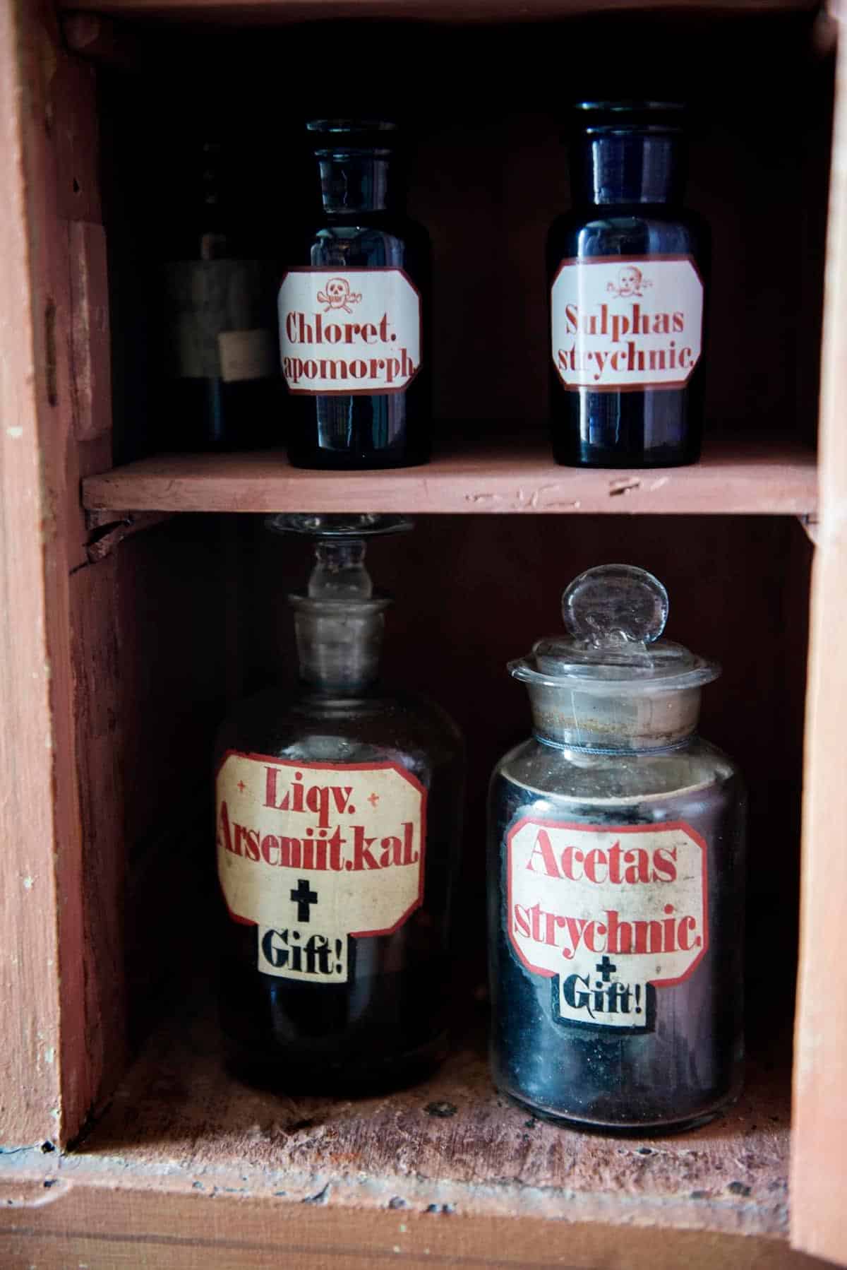 Så viste hun det aller helligste i 1800-tallsapoteket: Giftskapet, hvor både stryknin og arsenikk sto i glasskrukker med advarselen «Gift!»