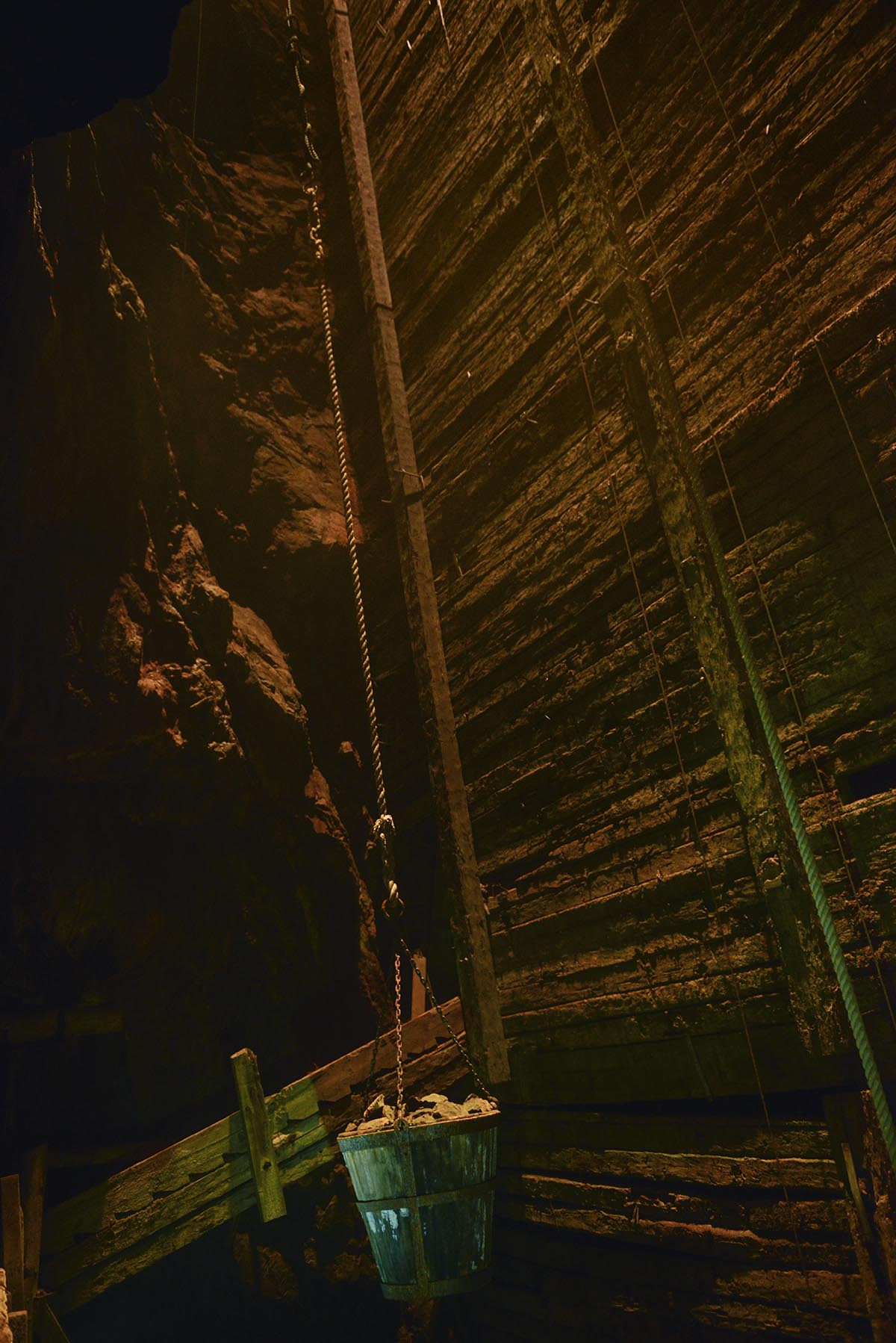 Ved en stor, trekledd sjakt stoppet han oss. I et rep midt i sjakta hang ei bøtte. Repet fortsatte oppover til det ble slukt av undergrunnsmørket.